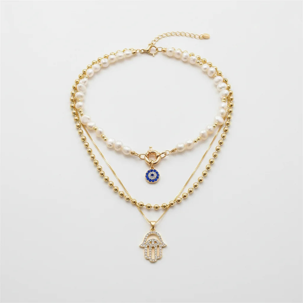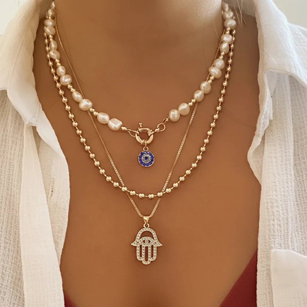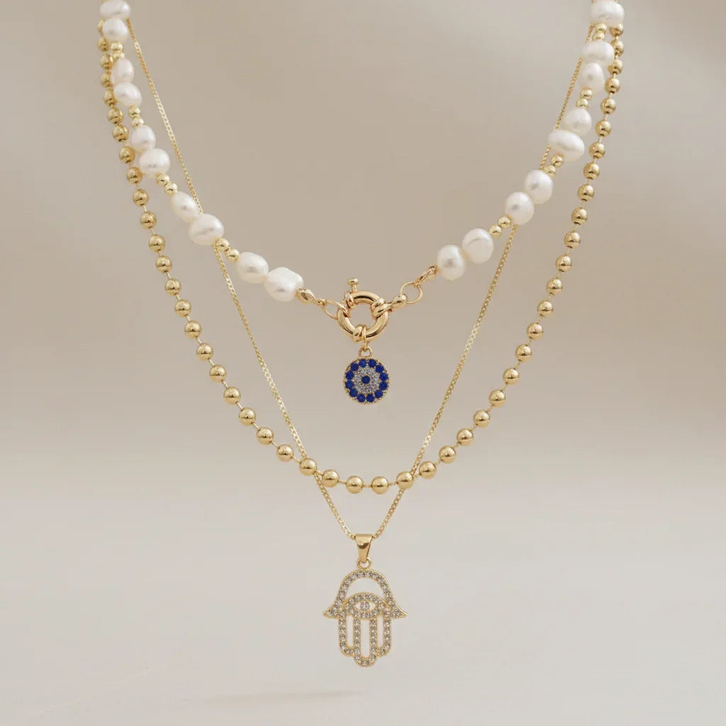 Chaque couche raconte une histoire. Le pendentif œil et la main de Hamsa, sertis de zircons, tissent une aura de protection et de distinction, sublimant votre essence.